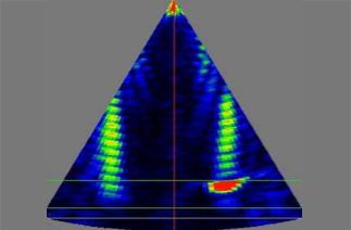 探針在螺栓上旋轉360°以致扇形掃描完全覆蓋螺紋。 左側圖顯示采用扇形掃查可以探測單個螺紋, 帶有缺陷區(qū)域的反射信號會顯著增加(紅色區(qū)域)